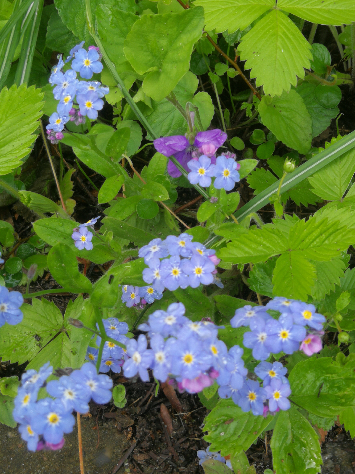 Forglemmigej (Myosotis sp.). En herlig lille plante med himmelblå blomster som spreder sig villigt. Bierne er glade for den og jeg synes at den pynter overalt.